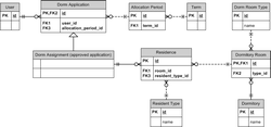 References: User, Dorm Application, Dorm Assignment, Allocation Period, Term, Residence, Resident Type, Dormitory Room (Dormroom), Dormroom Type, Dormitory.